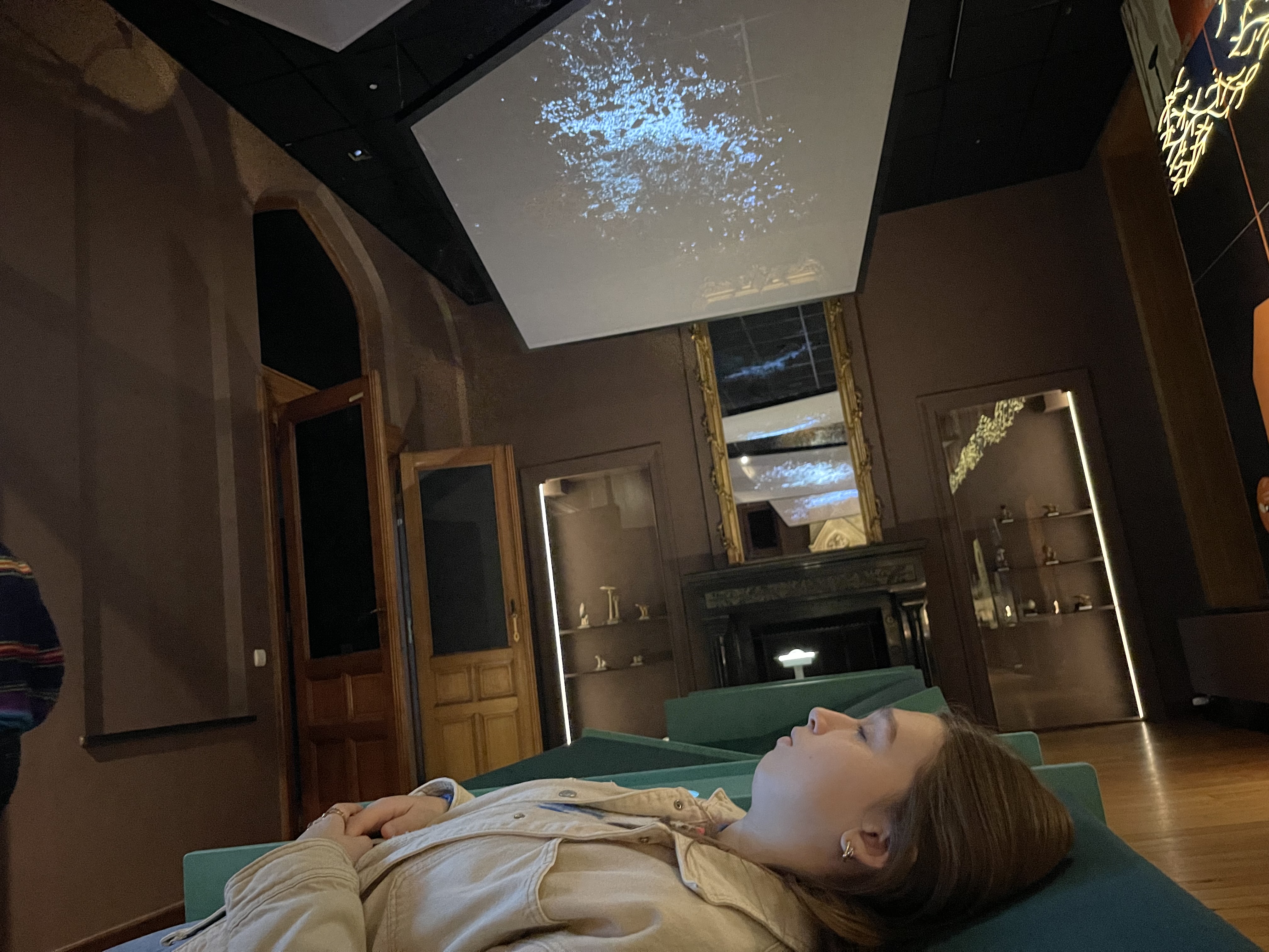In de tweede ruimte staat er een grote duwknop en vind je moderne ligbanken in het midden van de zaal. Duw op de knop, leg je neer en kijk naar het plafond. Een hele mooie projectie en uitleg over het leven onder de grond, die zich afspeelt tussen en onder de wortels van de bomen. Je waant je ook onder de grond en leert meer over het mycorrhizanetwerk. Wist jij dat er een wonderlijke samenwerking is tussen bomen en zwammen?