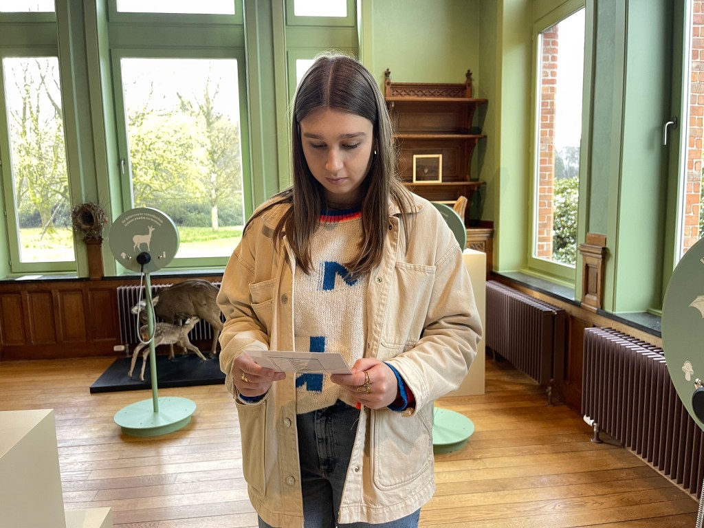 Het bezoekerscentrum is gevestigd in het kasteel, op korte loopafstand van de parking, de vijver, tearoom en speelplein. Als je binnengaat heb je een mooie ontvangstruimte met display en brochures met wandelingen, fietsroutes, de Riebedebiegids, … en twee vriendelijke dames die je helpen met de start van het parcours. Er is een gratis gedeelte en betalend gedeelte. Het gelijkvloers is op zich al heel leerrijk maar ik kan je alleen maar aanraden om ook de interactieve tentoonstelling boven mee te pikken, want het is echt heel mooi aangepakt met coole technieken, film en geluid.