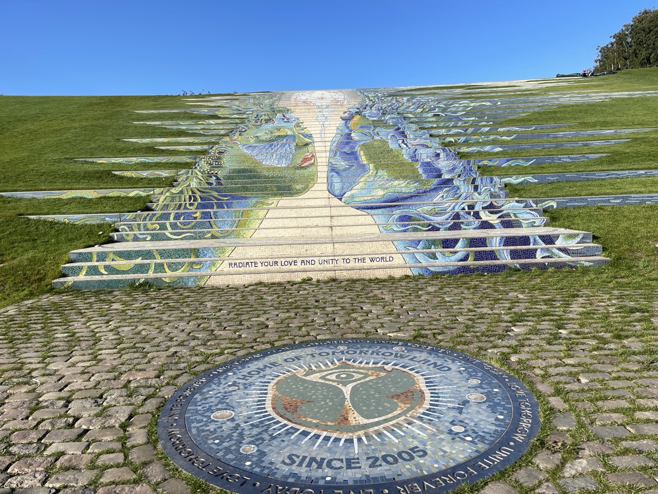 Als je het trollenbos uitwandelt kom je eigenlijk op de ‘mainstage‘ terecht. Ik noem het zo omdat hier ieder jaar het hoofdpodium van Tomorrowland wordt opgezet maar het is eigenlijk een heel mooi centraal plein met rond om rond hellingen, een soort ligweide en de Stairway to Unity. De beroemde trap met 5 miljoen mozaïeksteentjes die ik eens kan fotograferen zonder dansende mensen :-). Ik zag er mensen gezellig uitrusten, hand in hand wandelen, een kindje reed met zijn fietsje de helling naar beneden, zalige plek gewoon. Een andere trap brengt je verder naar de One World Brug. Terug een werk van een kunstenaar Arne Quinze naar aanleiding van 10 jaar Tomorrowland. Hier lees je 210.000 wereldwijde boodschappen op houten latten, zelfs huwelijksaanzoeken! Onderweg kom je een 25-meter hoge sculptuur tegen dus je valt eigenlijk van de ene verwondering in de andere. Zoveel diversiteit, als je er oog voor hebt natuurlijk of als je graag op zoek gaat naar details!