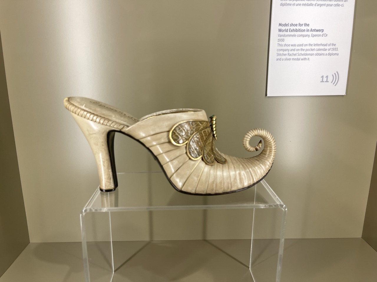 Het schoenmodel voor de wereldtentoonstelling in Antwerpen in 1930 is het paradepaardje van Eperon d’Or. Zij wonnen er een zilveren medaille mee. Ook het model voor de Wereldtentoonstelling in Brussel in 1935 mag ‘op zijn hakken staan’. En zo is er veel te bewonderen maar je moet het gewoon met eigen ogen zien!