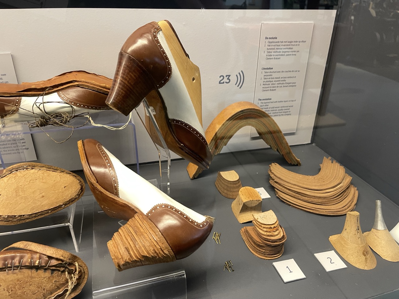 En “kijk mama, vroeger was er zelfs geen verschil tussen een linker- of rechterschoen”; dat is het geval tot het einde van de 19e eeuw. En wat een werk; wat een werk voor een typische ‘Zebra-methode’ voor het maken van een hak. Dat gaat over een opgebouwde hak met laagjes leder op elkaar. Chapeau voor deze technieken en ambacht! Je kan het allemaal zien en leren door alle taferelen af te lopen in deze hal.